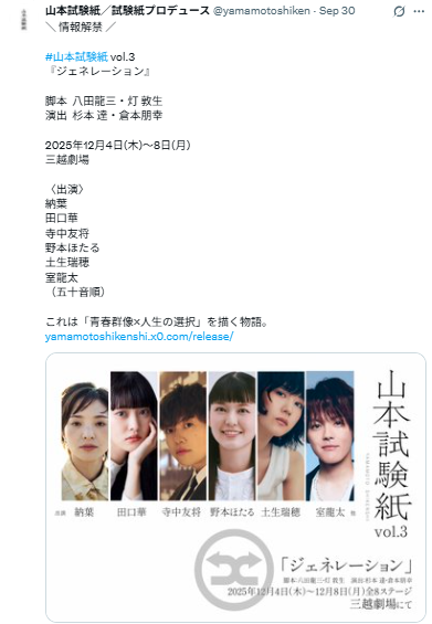 出演者には室龍太、土生瑞穂をはじめ、山本試験紙のメンバーが参加します。